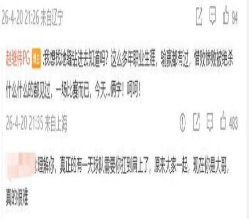 隨后繼偉還在評(píng)論區(qū)留言:我想找地縫鉆進(jìn)去知道嗎?這么多年職業(yè)生涯,輸贏都有過(guò),惜敗慘敗被絕殺什么什么的都見(jiàn)過(guò),一場(chǎng)比賽而已,今天…倆字!呵呵!繼偉今日如此反常,十分罕見(jiàn),不知道是不滿隊(duì)友表現(xiàn)還是不滿裁判吹罰他技犯?