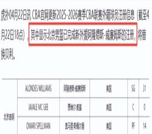 北京時(shí)間4月22日,根據(jù)CBA官方的公示,北京男籃正式裁掉了小外援貝利,注冊(cè)新外援阿隆德斯·威廉姆斯。 再加上趙...