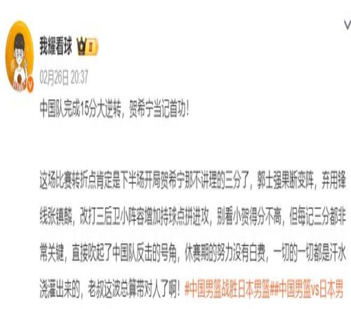《半島都市報(bào)》、青島男籃隨隊(duì)記者杜金城賽后也表示,中國(guó)男籃這場(chǎng)比賽之所以能逆轉(zhuǎn),賀希寧、趙繼偉兩人居功厥偉,這兩人就是首功。