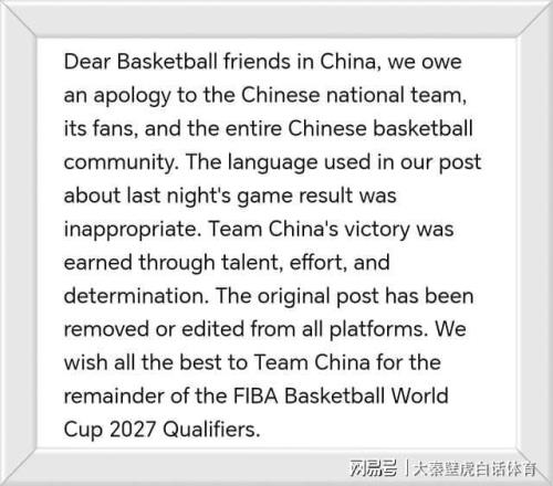 “親愛(ài)的中國(guó)籃球球迷朋友們,我們謹(jǐn)向中國(guó)國(guó)家隊(duì)、中國(guó)球迷以及整個(gè)中國(guó)籃球界致歉。