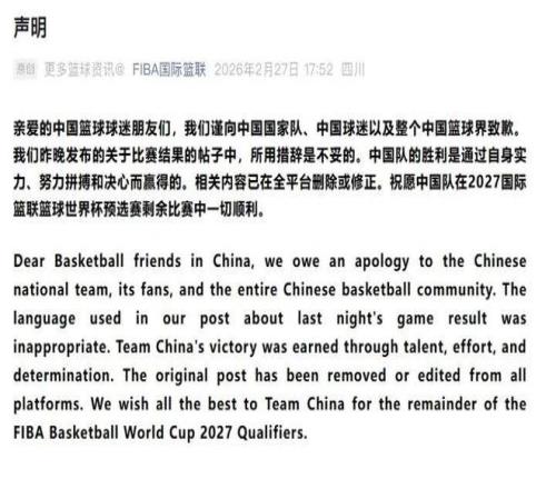 FIBA官方發(fā)表聲明,向中國男籃致歉......