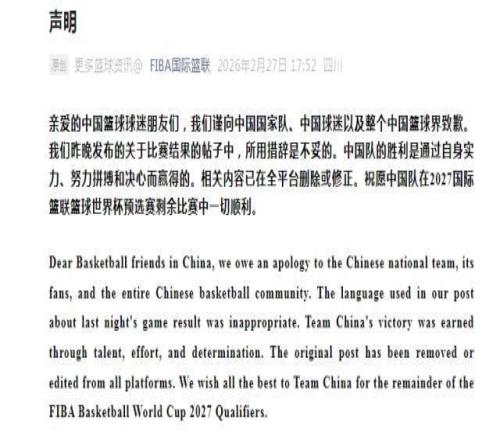 親愛的中國籃球球迷朋友們,我們謹向中國國家隊、中國球迷以及整個中國籃球界致歉。我們昨晚發(fā)布的關于比賽結果的帖子中,所用措辭是不妥的。中國隊的勝利是通過自身實力、努力拼搏和決心而贏得的。相關內容已在全平臺刪除或修正。祝愿中國隊在2027國際籃聯籃球世界杯預選賽剩余比賽中一切順利。