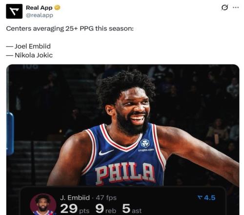 這也是恩比德本賽季重回賽場后表現(xiàn)的縮影,本場比賽后,恩比德場均得分來到25.2分,他與約基奇(29.6)是聯(lián)盟本賽季僅有的兩名場均得分超過25分的中鋒。