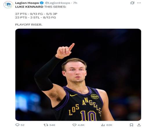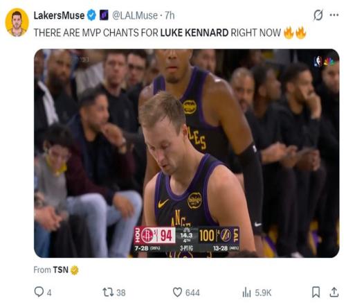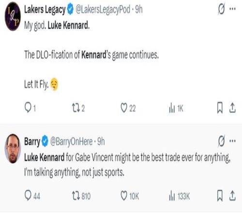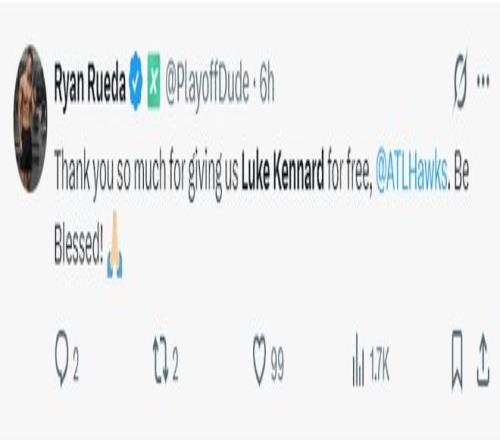 湖人記者Ryan Rueda致謝老鷹,他寫道:非常感謝亞特蘭大老鷹交肯納德送給我們。保佑老鷹隊吧。