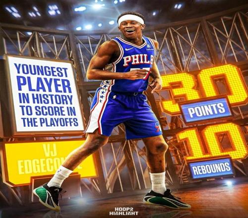 ——20歲265天單場(chǎng)30分10板,超越魔術(shù)師(20歲276天),季后賽歷史最年輕