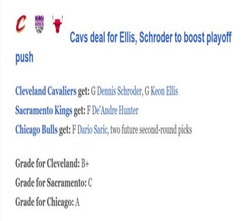 針對(duì)這一筆3方交易,權(quán)威美媒ESPN也火速給出交易評(píng)分,其中第三方公牛成為大贏家,騎士也拿下B+高評(píng)分,反而是國(guó)王壓著及格線僅獲C。