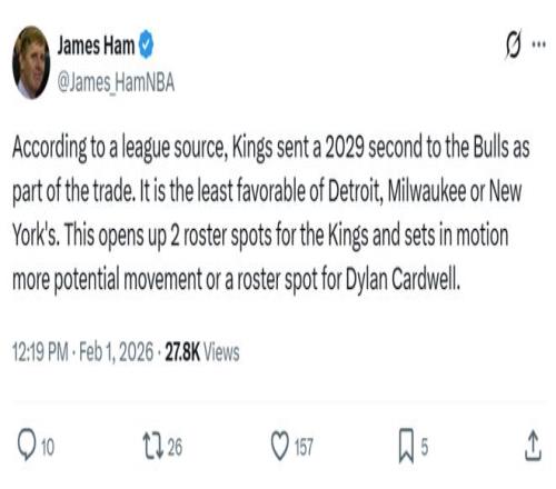 整個(gè)交易中公牛隊(duì)僅吃下薩里奇的合同,就拿到了兩枚次輪簽回報(bào),哪怕國(guó)王隊(duì)記James Ham后續(xù)跟進(jìn)指出,國(guó)王送走的29年次輪簽是活塞、雄鹿和尼克斯三個(gè)次輪中順位最低的一個(gè)也依舊無(wú)法改變這一點(diǎn)。