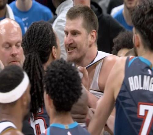 比賽末節(jié),約基奇這賽季的一個名場面出現(xiàn)。多爾特的一個壞動作將約基奇撞倒,約基奇起身之后馬上急眼找多爾特要說法,杰林追上來揪住約基奇的球衣拉扯,約基奇呲著牙怒目而視,場面一度非常嚇人。