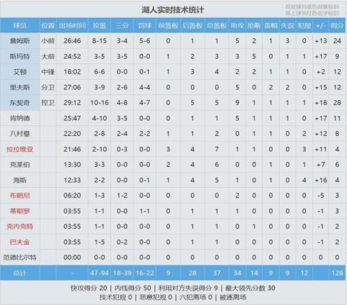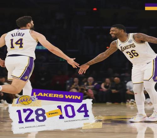 三節(jié)戰(zhàn)罷,湖人96-76領(lǐng)先整整20分。詹姆斯前三節(jié)11中5得到14分,第四節(jié)4中3砍下10分。最后半節(jié)雙方換上純替補(bǔ)陣容,全場(chǎng)結(jié)束,湖人128-104大勝?lài)?guó)王24分,背靠背取得2連勝。東契奇28分5板9助、詹姆斯24分5助2斷。
