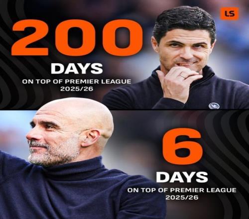 槍手本賽季占據(jù)榜首達200天 曼城11天抹平差距登頂