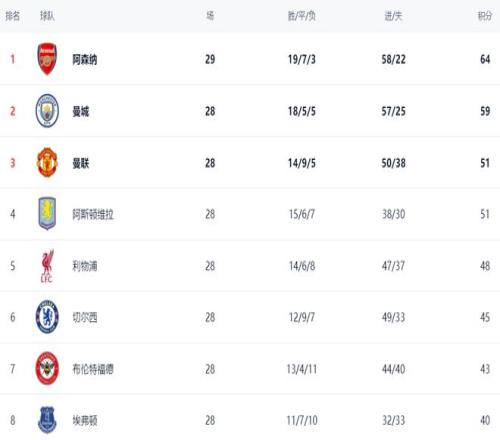 在積分榜上,阿森納以64分領跑,戰(zhàn)績是19勝7平3負。曼城拿到59分,排名第2。阿森納比曼城多了5分,但比曼城多踢1場。曼聯(lián)贏球之后升到了第3名,總積分達到51分。阿斯頓維拉也是51分,但凈勝球遠不如曼聯(lián),排名掉到第4。利物浦以48分排名第5。切爾西輸球后,積分依然是45分,排名第6。布倫特福德43分,排名第7。