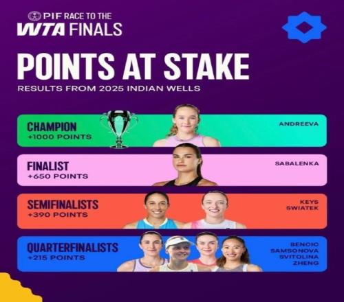WTA1000印第安維爾斯站保分情況:鄭欽文8強215分,薩巴亞軍615分