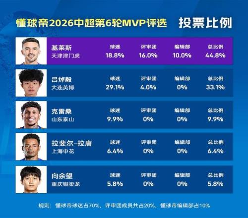大家好,歡迎來到懂球帝2026賽季中超MVP的評選現(xiàn)場。天津津門虎前鋒基萊斯憑借與玉昆一役中兩射一傳的出色表...