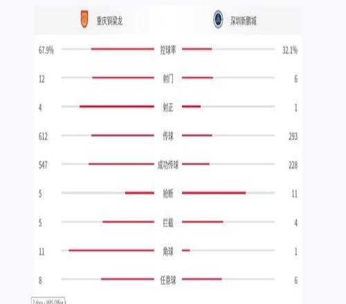 本場數(shù)據(jù)方面,銅梁龍與新鵬城的控球率是67.9%-32.1%,射門為12-6,傳球為612-293,角球是11-1。從數(shù)據(jù)上看,銅梁龍比賽中完全占據(jù)上風(fēng)。