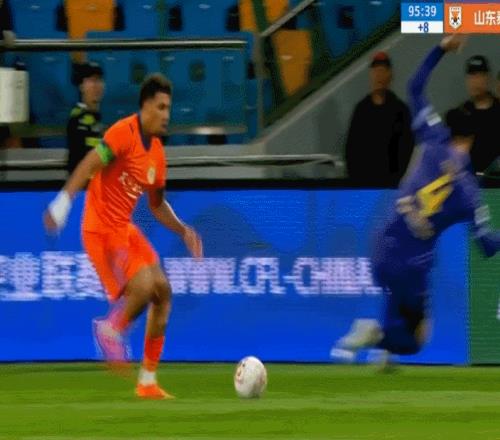 站起來(lái)后,面對(duì)質(zhì)疑,楊帆義正言辭地解釋自己是鏟到了球(下圖)。奇怪的是,接下來(lái)的比賽中VAR視頻助理裁判也沒(méi)有介入,讓楊帆成功逃掉了一張紅牌。